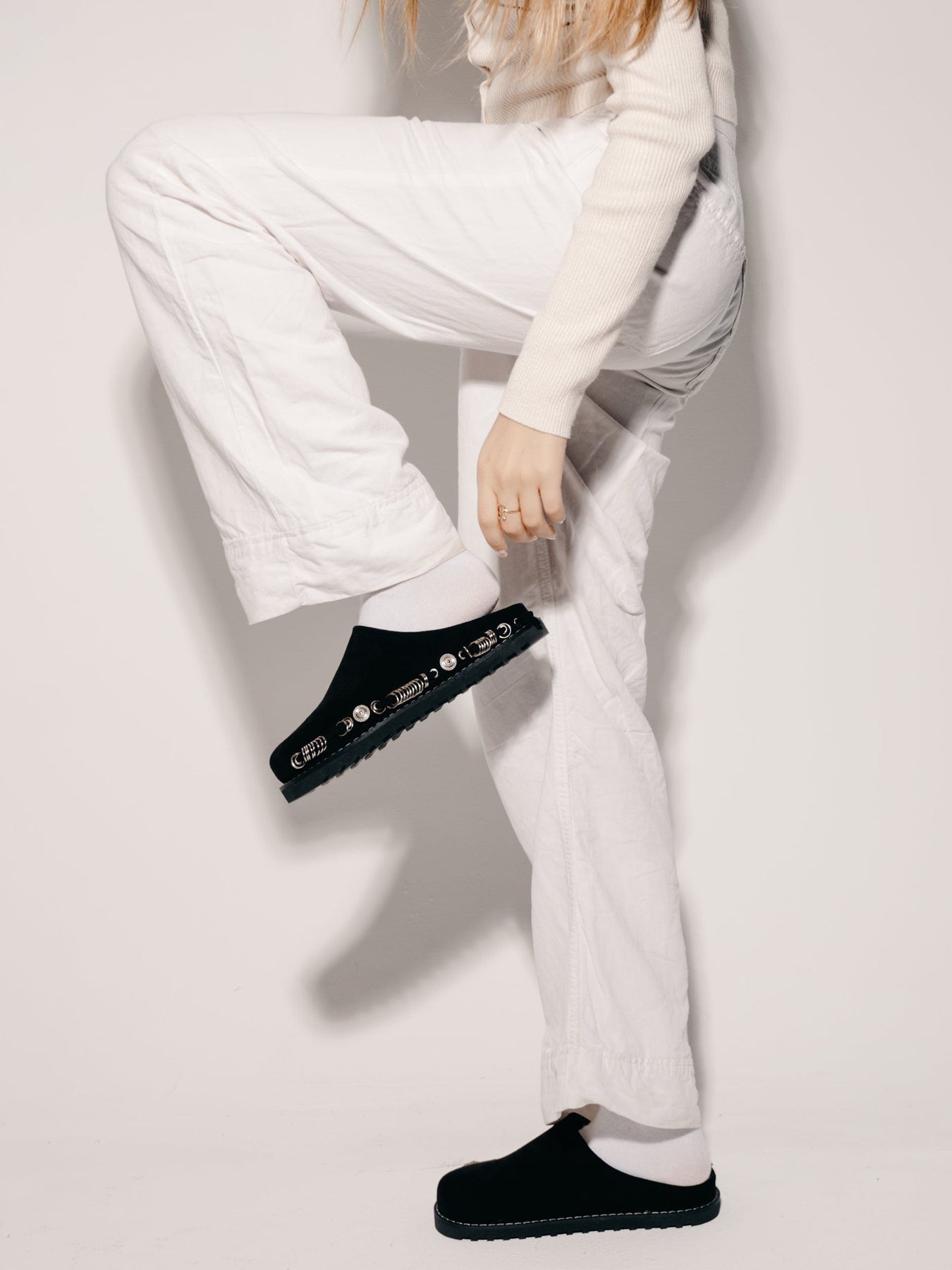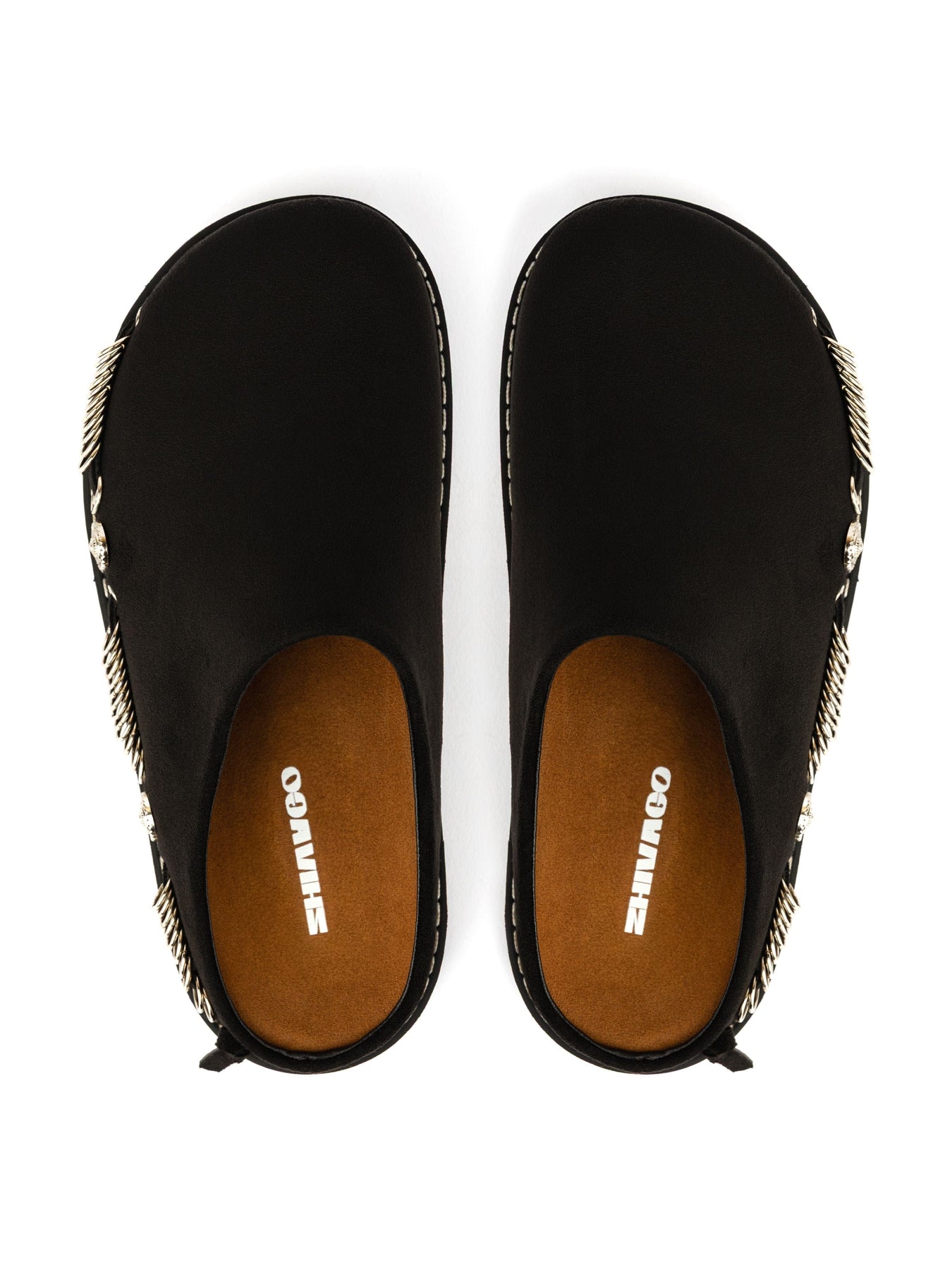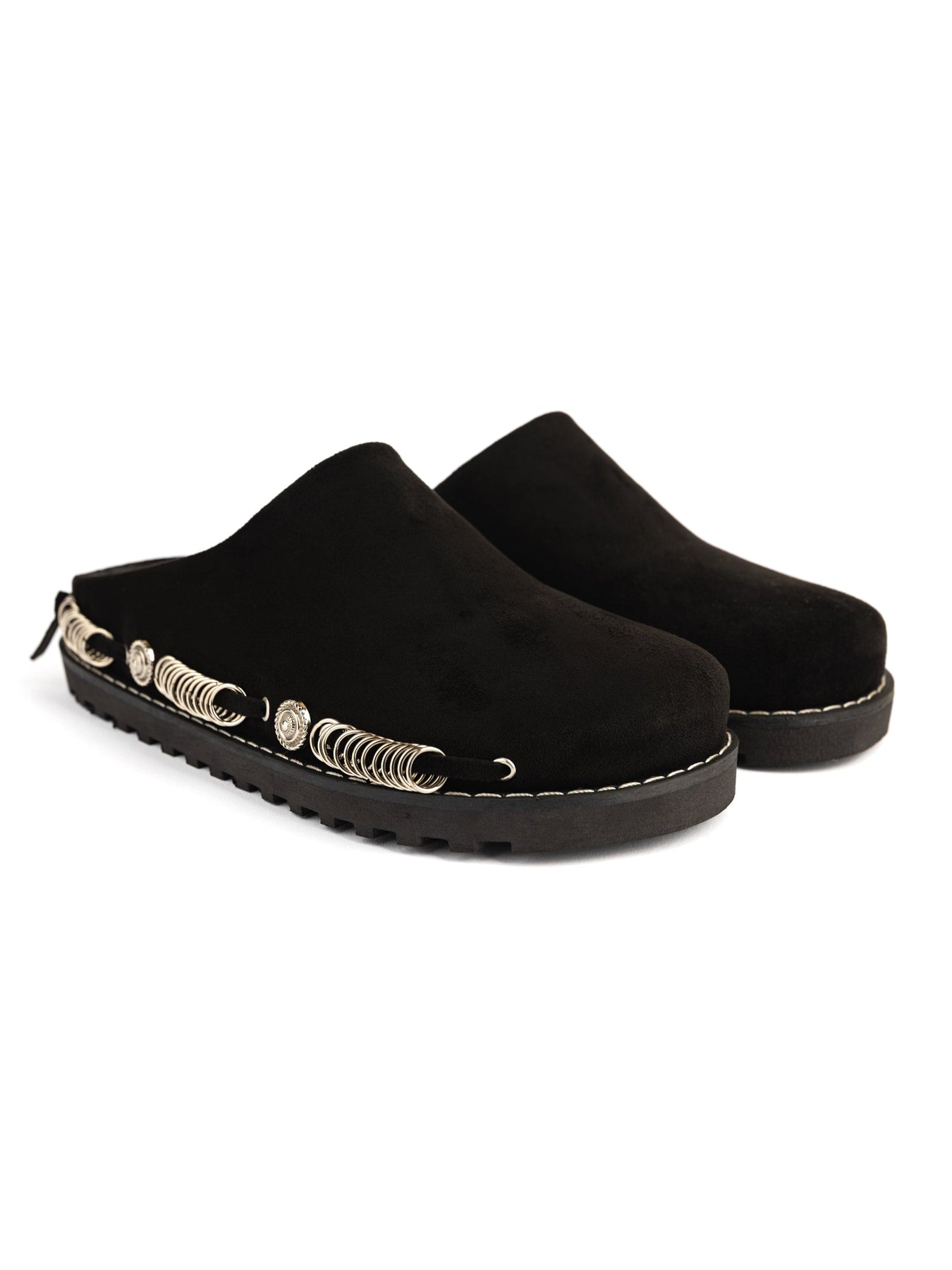 Revo Black slides combine a refined velvet upper with sturdy metal rings on the sides, offering a sleek yet durable design. These slides provide a sophisticated look suitable for both casual and upscale settings while ensuring comfort and long-lasting wear. Ideal for those seeking a stylish, contemporary footwear option that stands out with subtle, high-quality details.