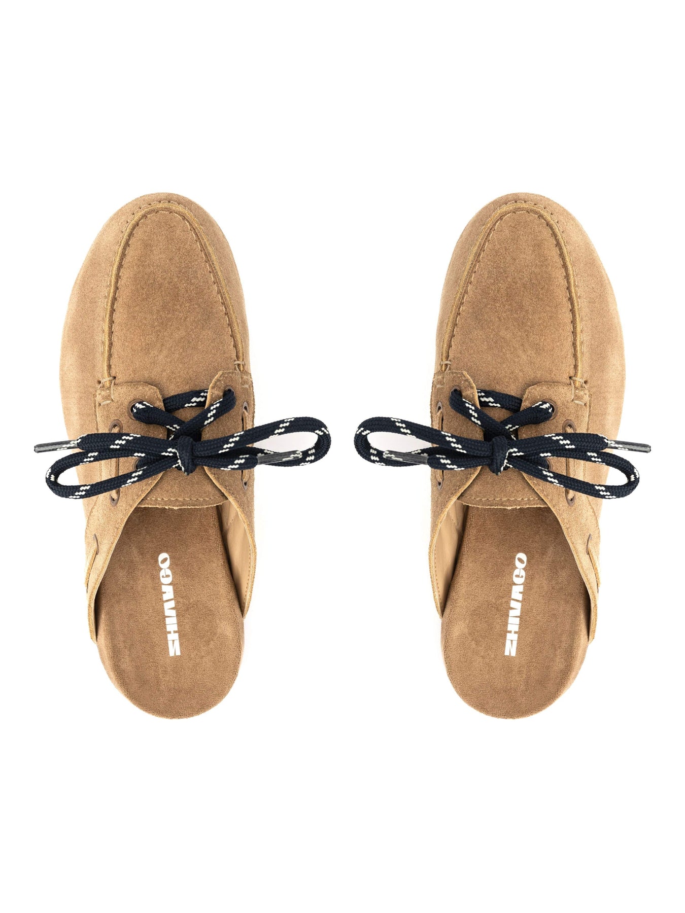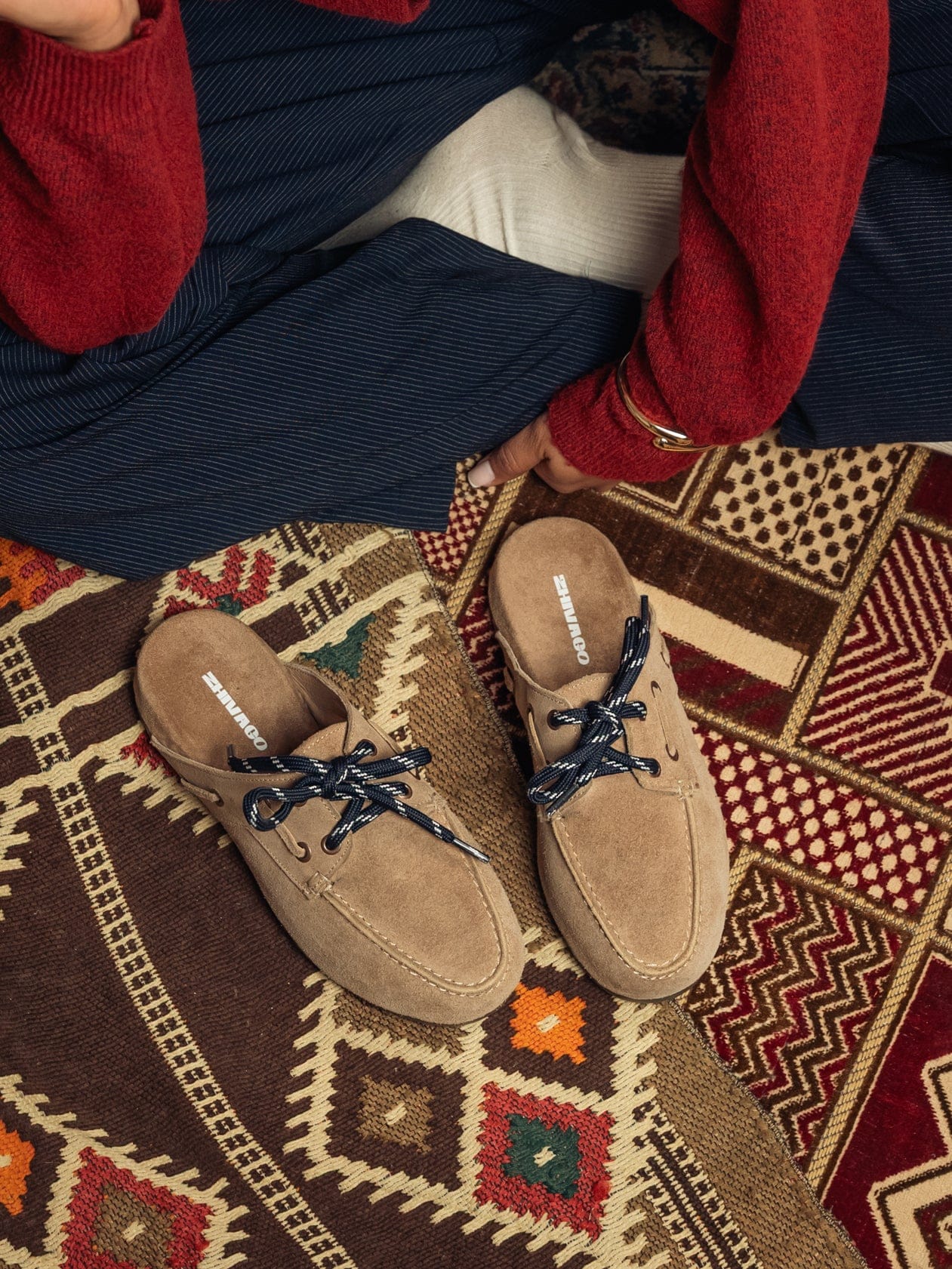 The standout feature? Nautical-inspired navy blue laces that provide a sharp, high-contrast pop against the neutral suede. Whether you're lounging on woven rugs or heading out for a weekend brunch, these mules bring a relaxed, coastal sophistication to any look. Pair them with oversized linen or cropped denim to let the details shine.