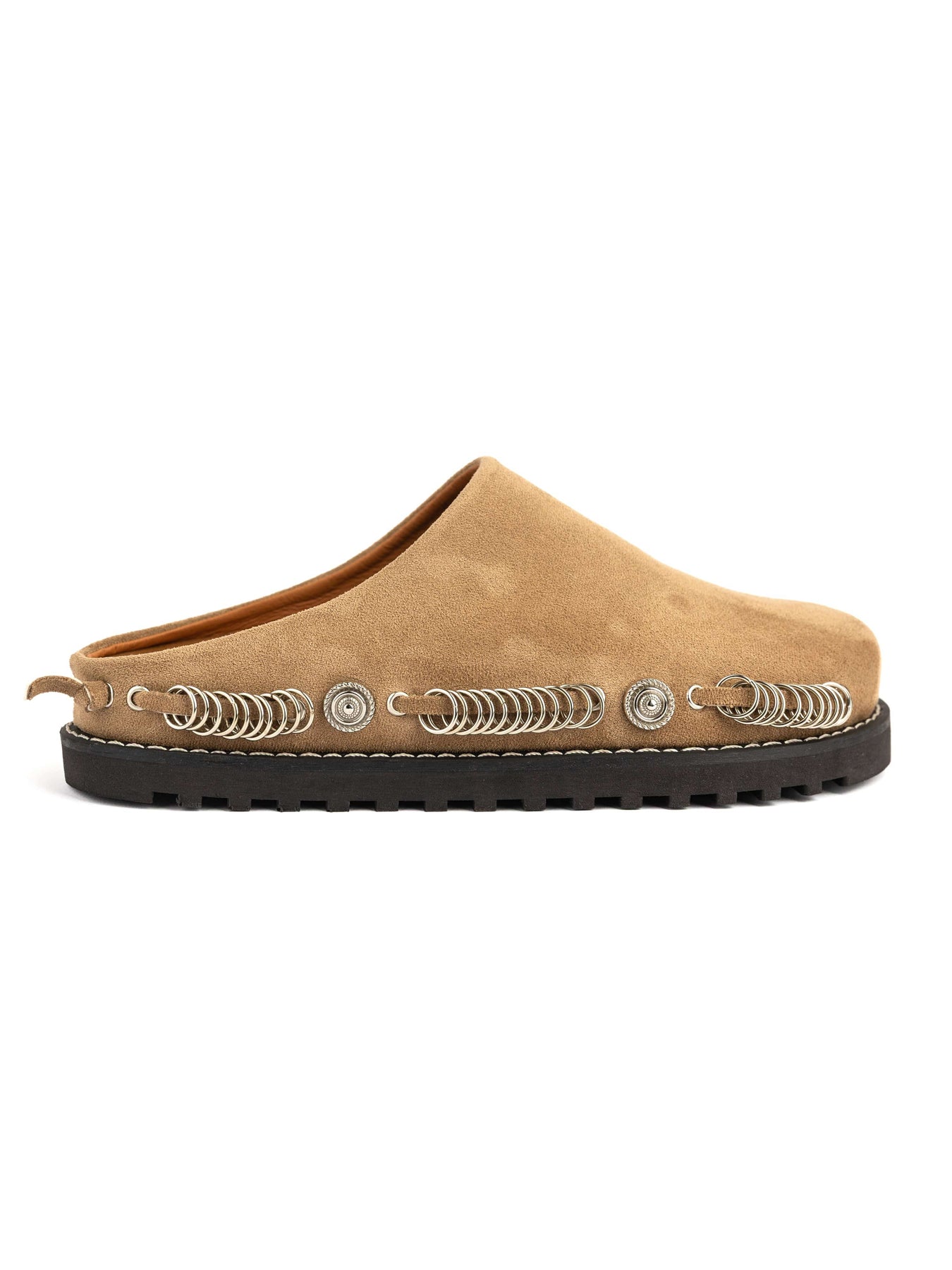 Revo Beige slides combine a refined velvet upper with sturdy metal rings on the sides, offering a sleek yet durable design. These slides provide a sophisticated look suitable for both casual and upscale settings while ensuring comfort and long-lasting wear. Ideal for those seeking a stylish, contemporary footwear option that stands out with subtle, high-quality details.