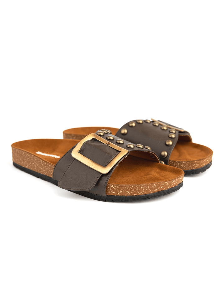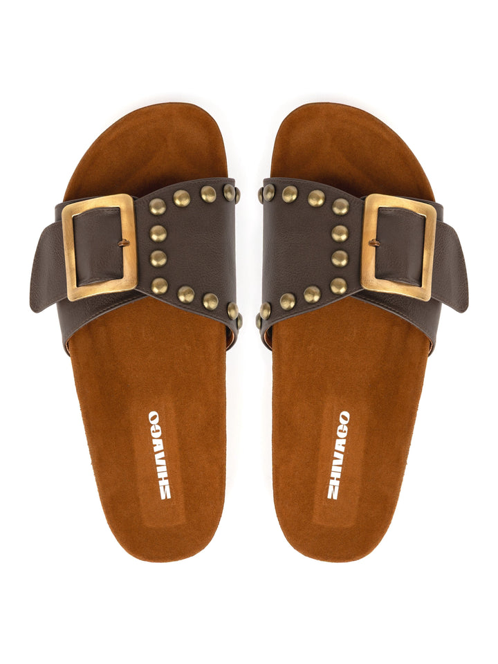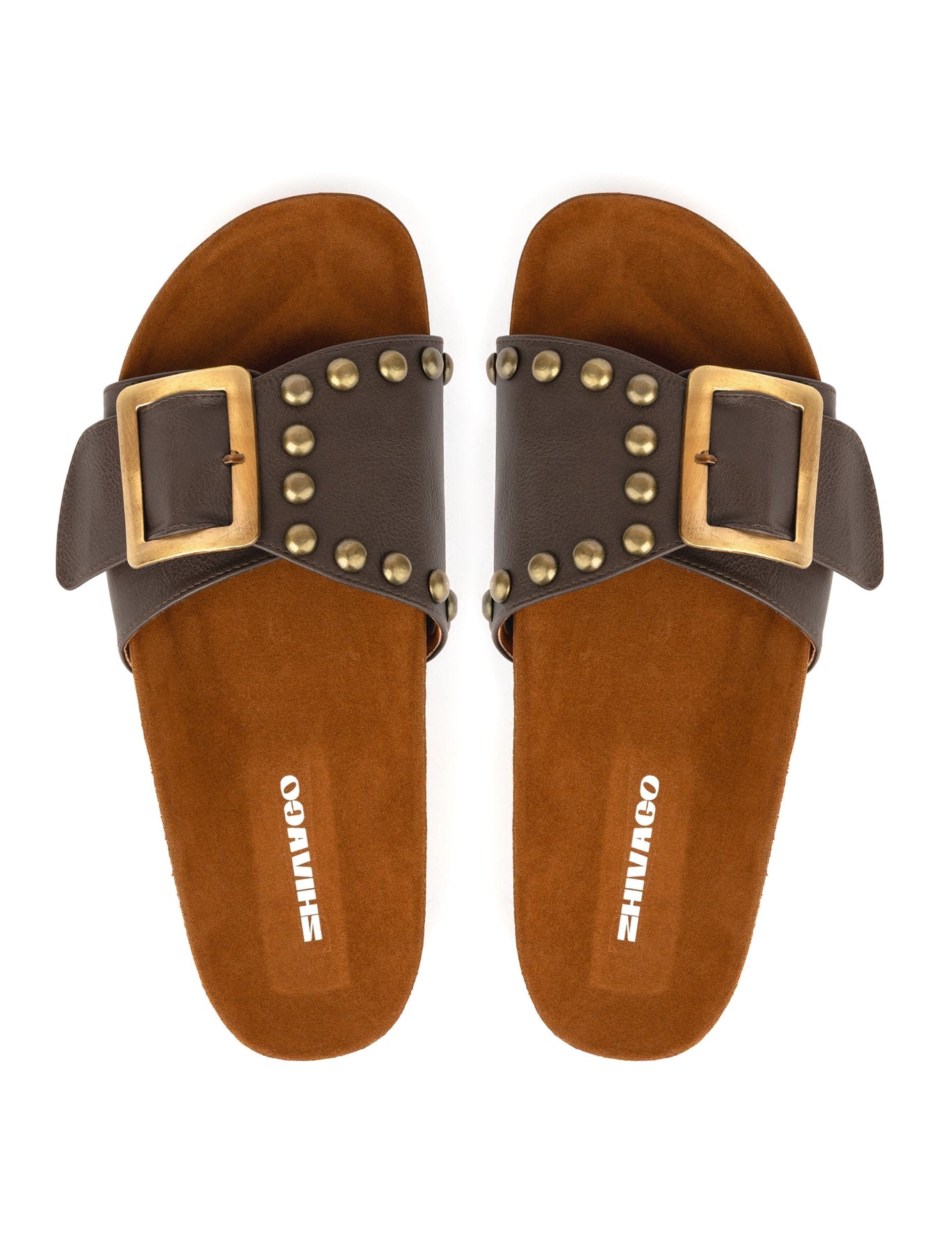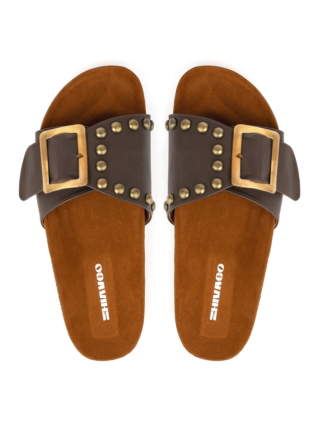 Add a touch of sophistication to your summer wardrobe with Franca Brown. These women's slides feature a bronze studs and a metal buckle, all adorned on a rich brown leather. Elevate your style with these perfect summer slides.